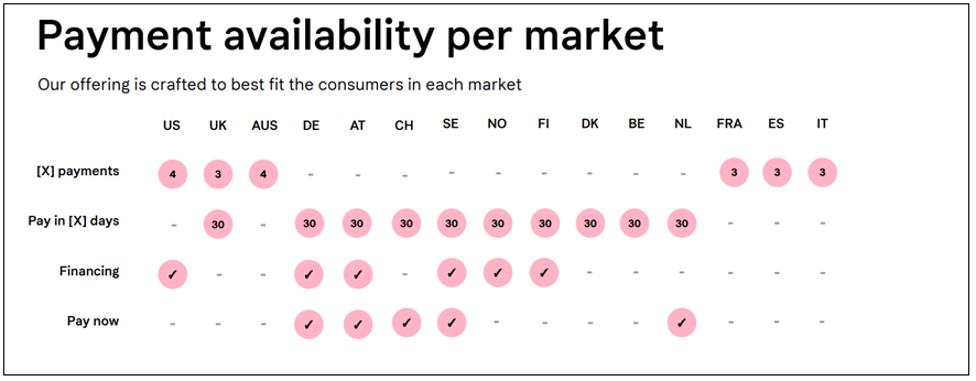 Klarna only appears on eligible purchases, which is determined based on the combination of your billing country and currency selection. For your reference, below is a list of flexible payment terms that may be available in your region.